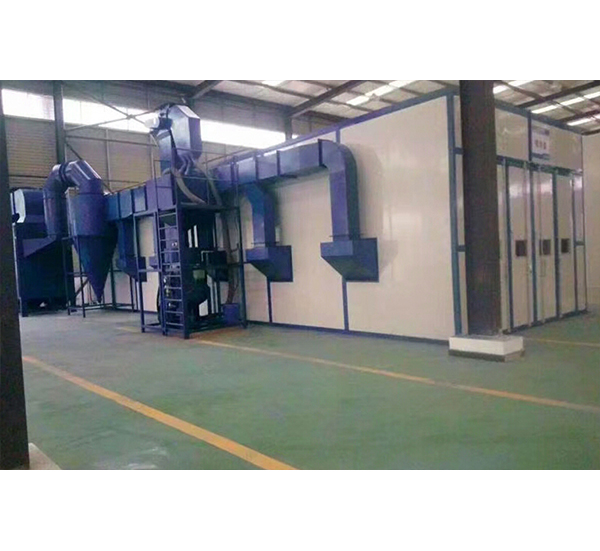 噴砂房又叫噴丸房、打砂房,適應(yīng)于一些大型工件表面清理、除銹,增加工件與涂層之間的附著力效果; 噴砂作業(yè)前,將工件送入噴砂室體,接通電、氣裝置,打開噴砂照明燈,穿戴好防護服,關(guān)閉主機門,手持噴砂槍,打開噴砂開關(guān),手持噴槍對零件進行噴砂清理。 噴射出來的鋼丸掉落到噴砂室底部回收處,通過螺旋推料器進入提升機將丸料回收,經(jīng)過旋風(fēng)分離器裝置對丸料、碎鋼丸、粉塵進行分離,合格的鋼丸直接進入噴砂器上方的儲料倉內(nèi),準(zhǔn)備再次利用。 碎鋼丸和粉塵則被除塵系統(tǒng)直接吸走,吸附于濾筒表面,除塵器脈沖閥會定時產(chǎn)生脈沖信號,將儲存于氣包中的壓縮空氣釋放,瞬間形成膨脹氣流作用于濾筒內(nèi)部,將吸附于濾筒表面的粉塵振動脫落,掉落于下端集塵斗中,定期進行清理。