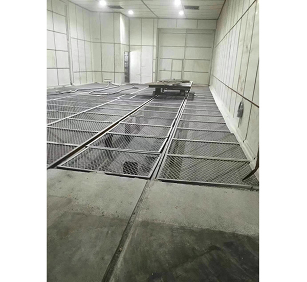 2. 噴砂室前面為工件進(jìn)出門,采用左右手動(dòng)開閉,地面安裝輕軌,有軌臺(tái)車運(yùn)送工件進(jìn)出噴砂室。