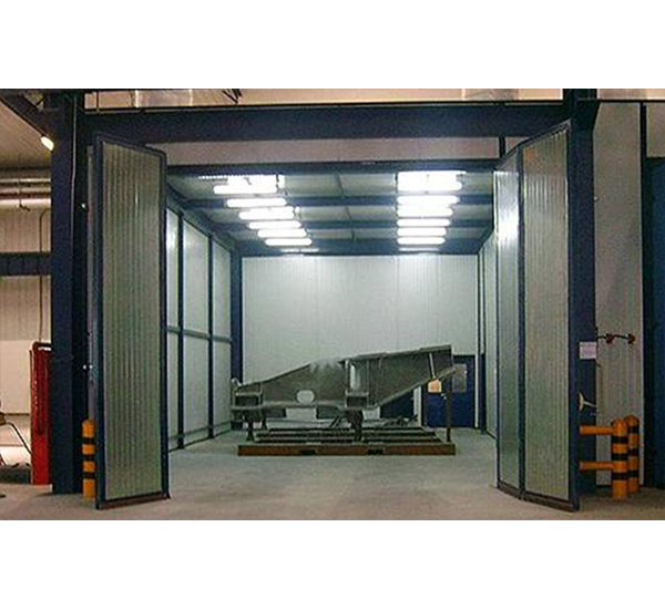 2. 噴砂室前面為工件進(jìn)出門,采用左右手動(dòng)開閉,地面安裝輕軌,有軌臺(tái)車運(yùn)送工件進(jìn)出噴砂室。